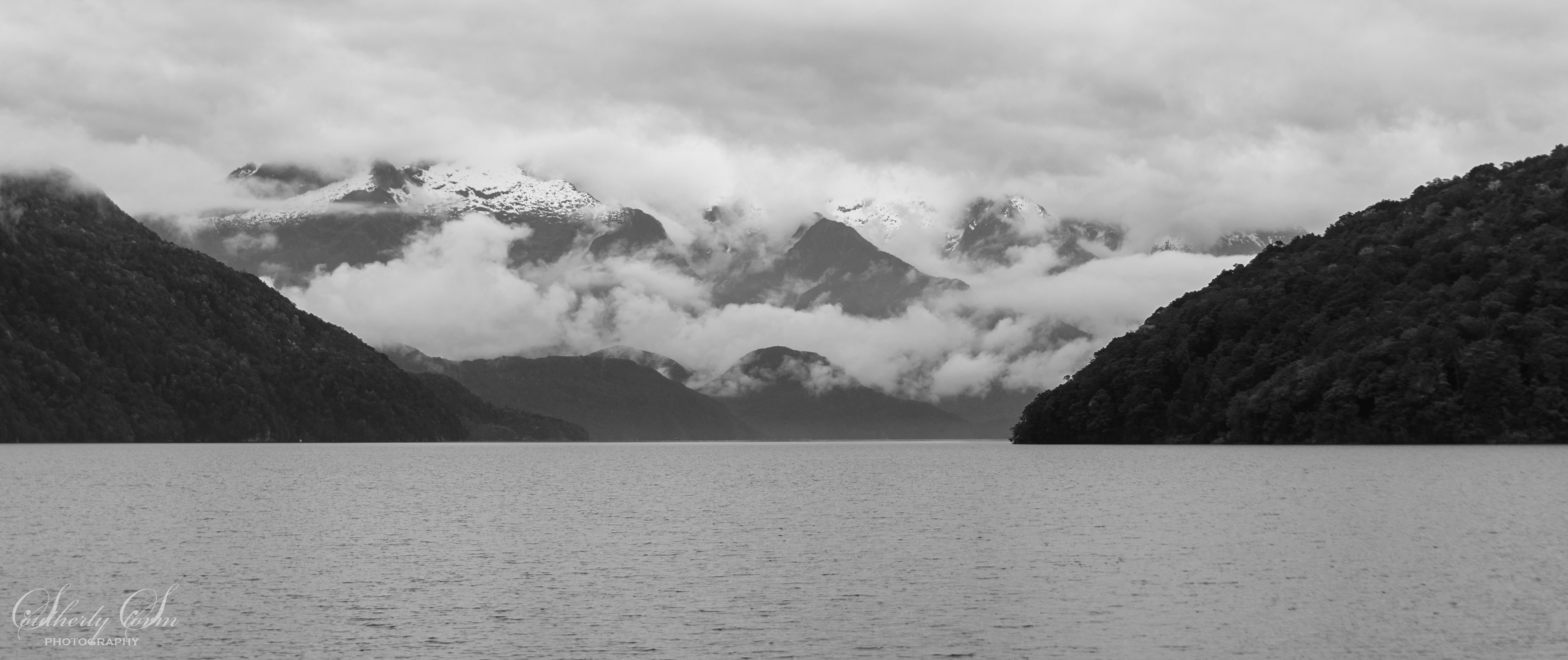 Lake Manapouri with cloudy mountains behind, it was a little bit too windy for me to want to packraft back around the lake alone, so I kept walking.