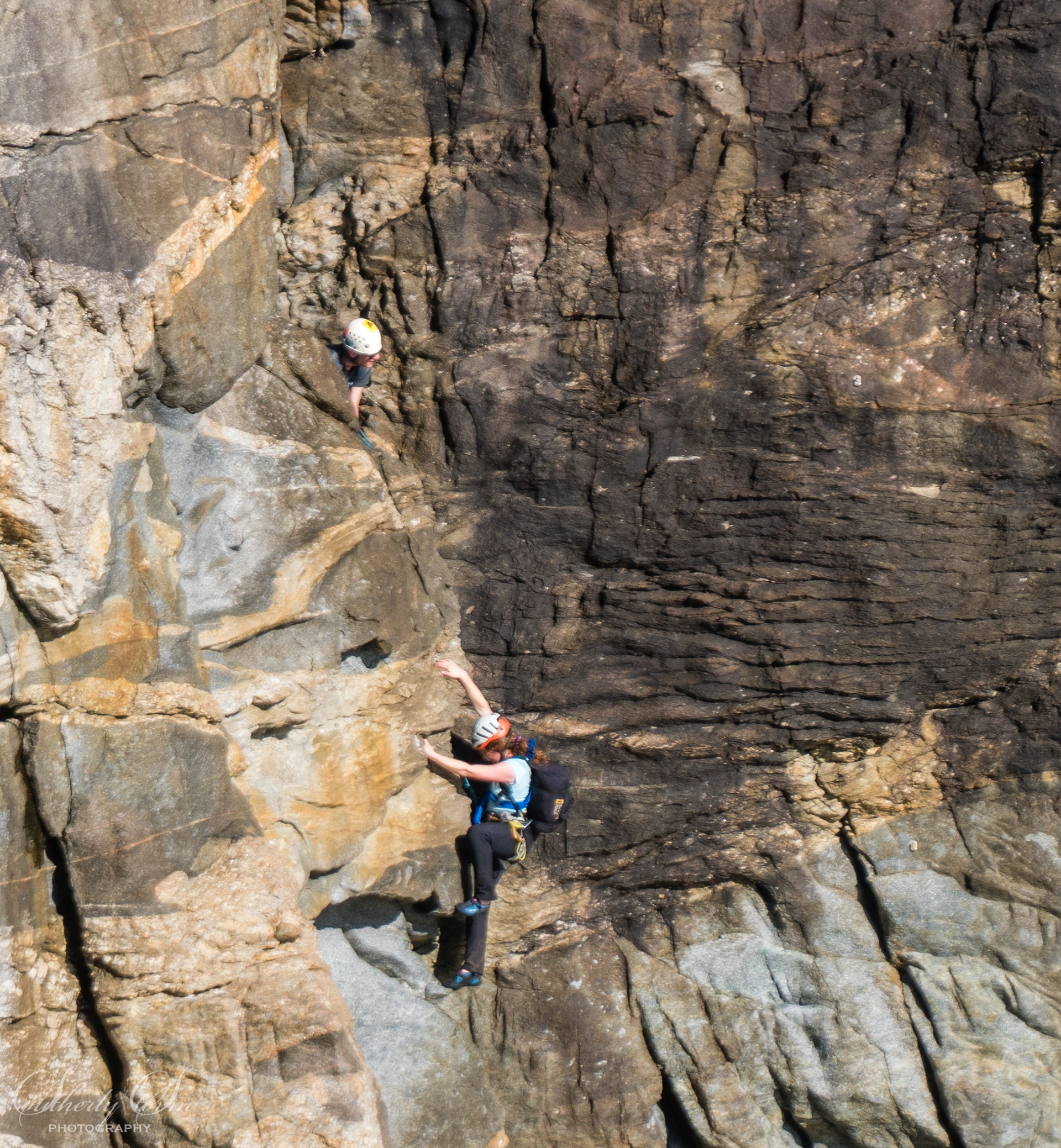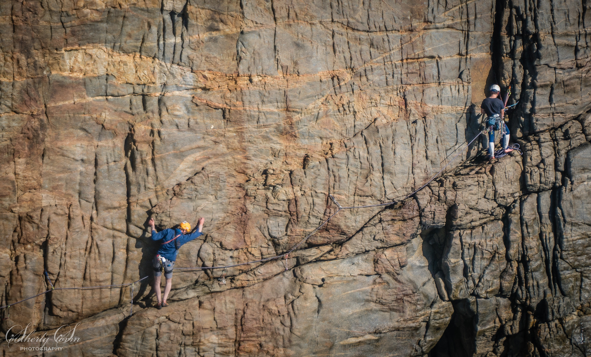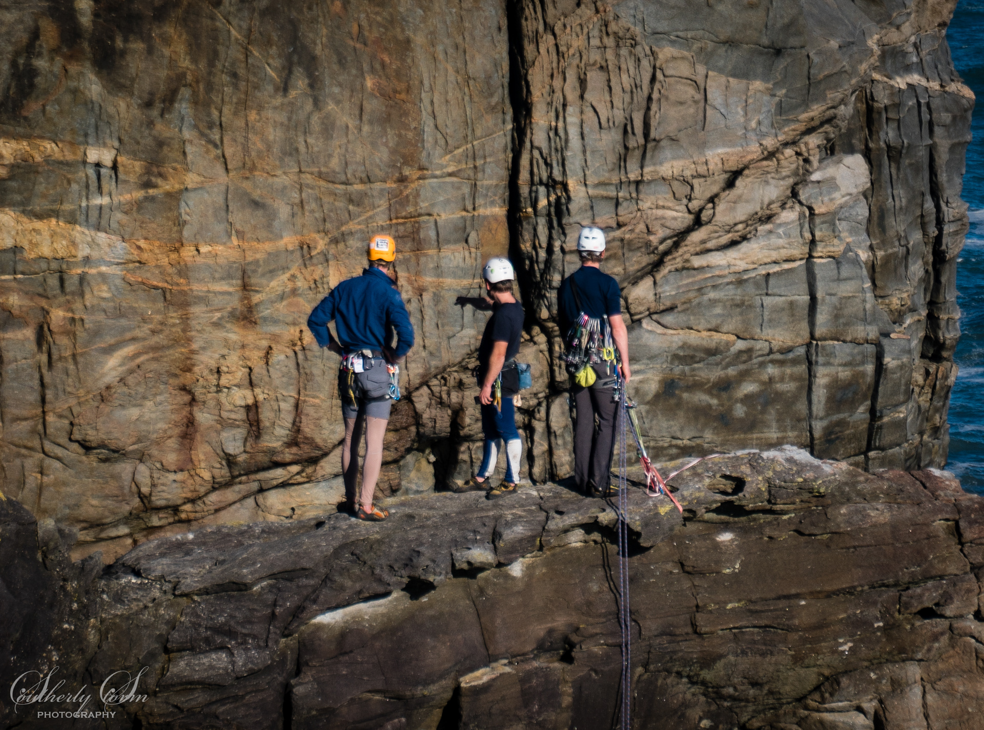 Jamie points out the traversing and climbing cracks of Shark's Breakfast to Ben and Luke. Much of the afternoon was spent on this iconic route, and while the sea did get, thankfully no sharks!